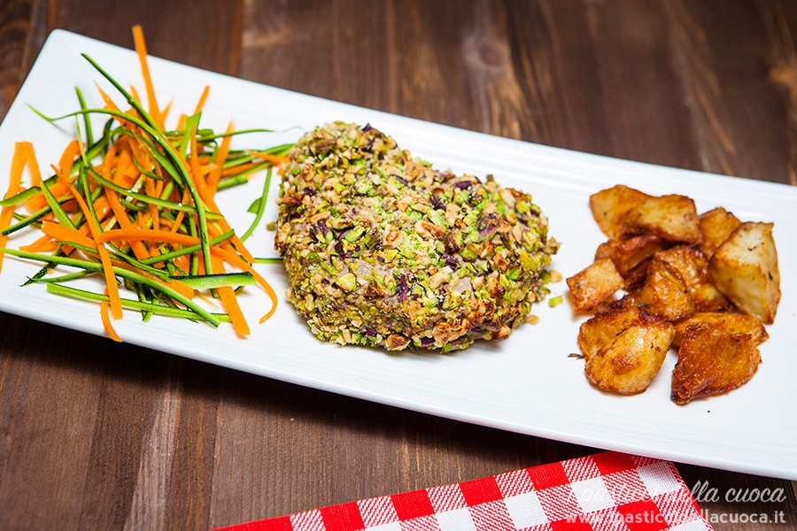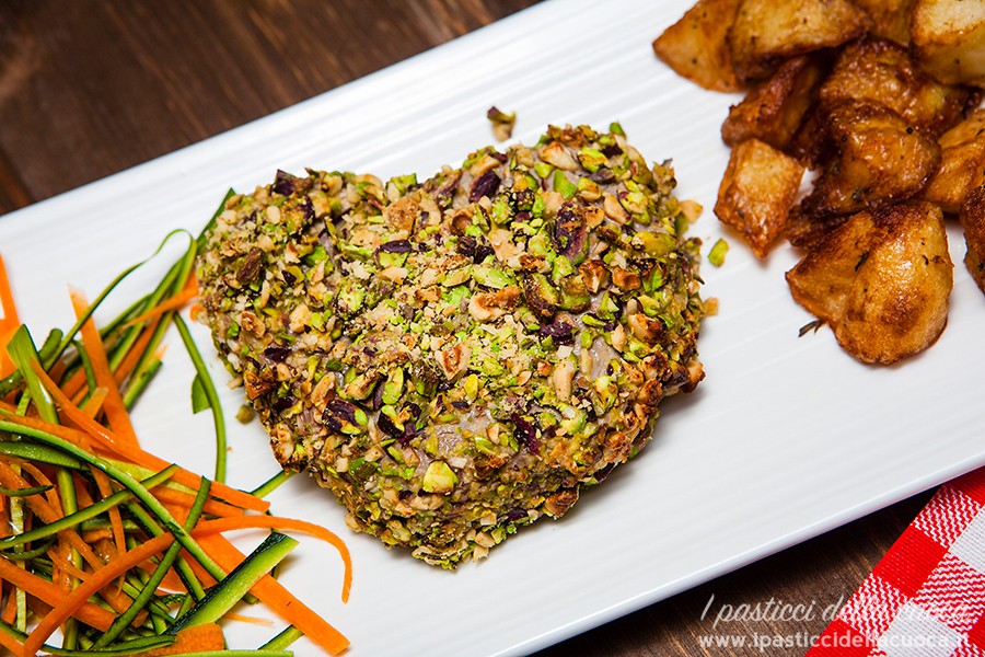 Passate il filetto sopra la granella di frutta secca, cercando di creare una panatura uniforme. Io ho utilizzato nocciole e pistacchi perché mi piacciono molto, ma potete utilizzare la frutta secca che più vi piace: pinoli, mandorle, noci, noccioline.