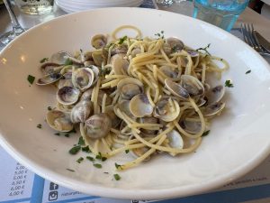 Non sono certificati, ma hanno la pasta senza glutine, ho mangiato un buon spaghetto con tante vongole. Gli spaghetti erano buoni, anche se forse un po’ si percepiva che erano diversi, la cosa che mi ha un po’ lasciato perplessa è che i gli spaghetti erano tutti spezzettati con anche pezzi molto piccoli, ho pensato che fosse dovuto al fatto che per evitare contaminazioni hanno dovuto prendere un pentolino ex novo e far scaldare l’acqua apposta e quindi per fare prima avessero usato un pentolino piccolino e sia stato necessario spezzettare gli spaghetti per farceli entrare, invece mio marito ha ipotizzato forse magari la fine di una scatola di spaghetti e fossero rimasti quelli più piccolini, un po’ sbriciolati. Boh non lo so, comunque sia ho mangiato tutto.