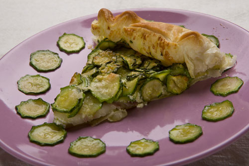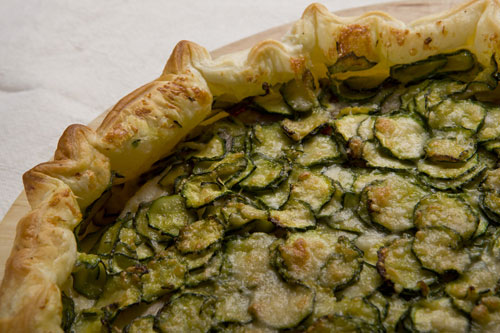 500 gr di zucchine – 1 rotolo di pasta sfoglia rotonda – 100 gr di ricotta – 40 gorgonzola – 30 gr di parmigiano – 50 pancetta tagliata fine – aglio – olio – sale – pepe