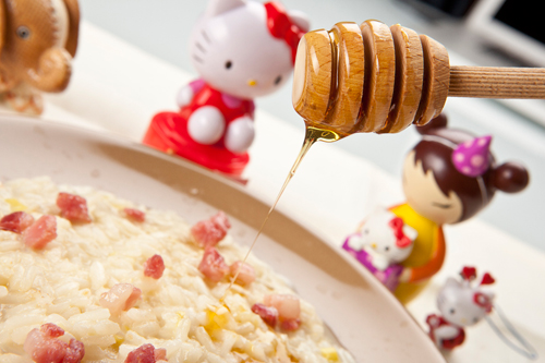 Mettete il riso nei piatti, mettete un po’ di pancetta sgocciolata e un altro filo di miele.